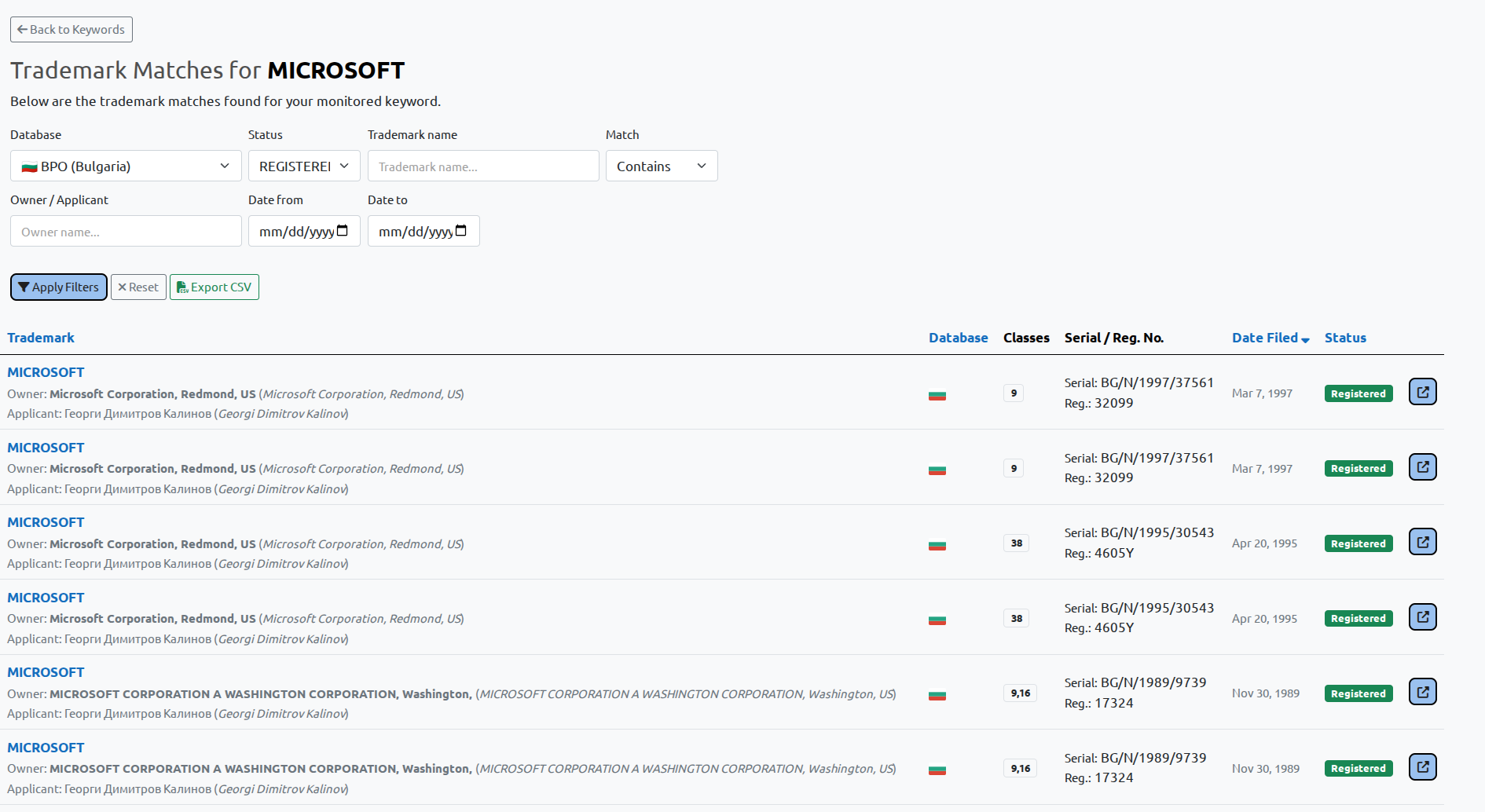 - Monitoring of trademark registrations and applications