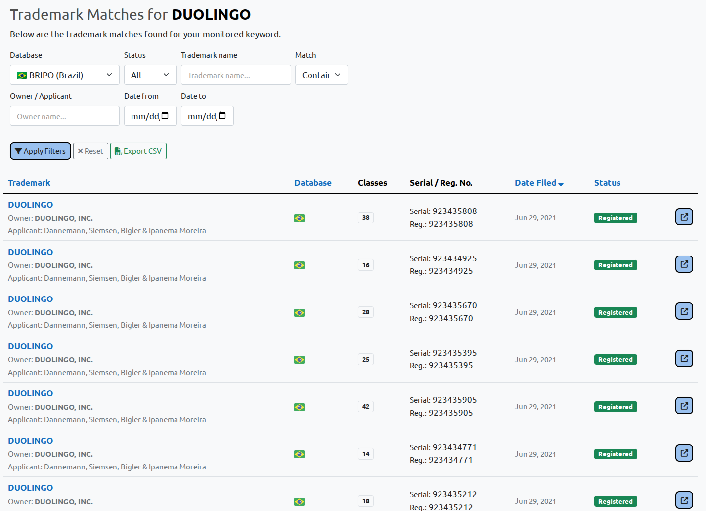 INPI Brazil trademark data is monitored continuously and matched weekly against your protected keywords.