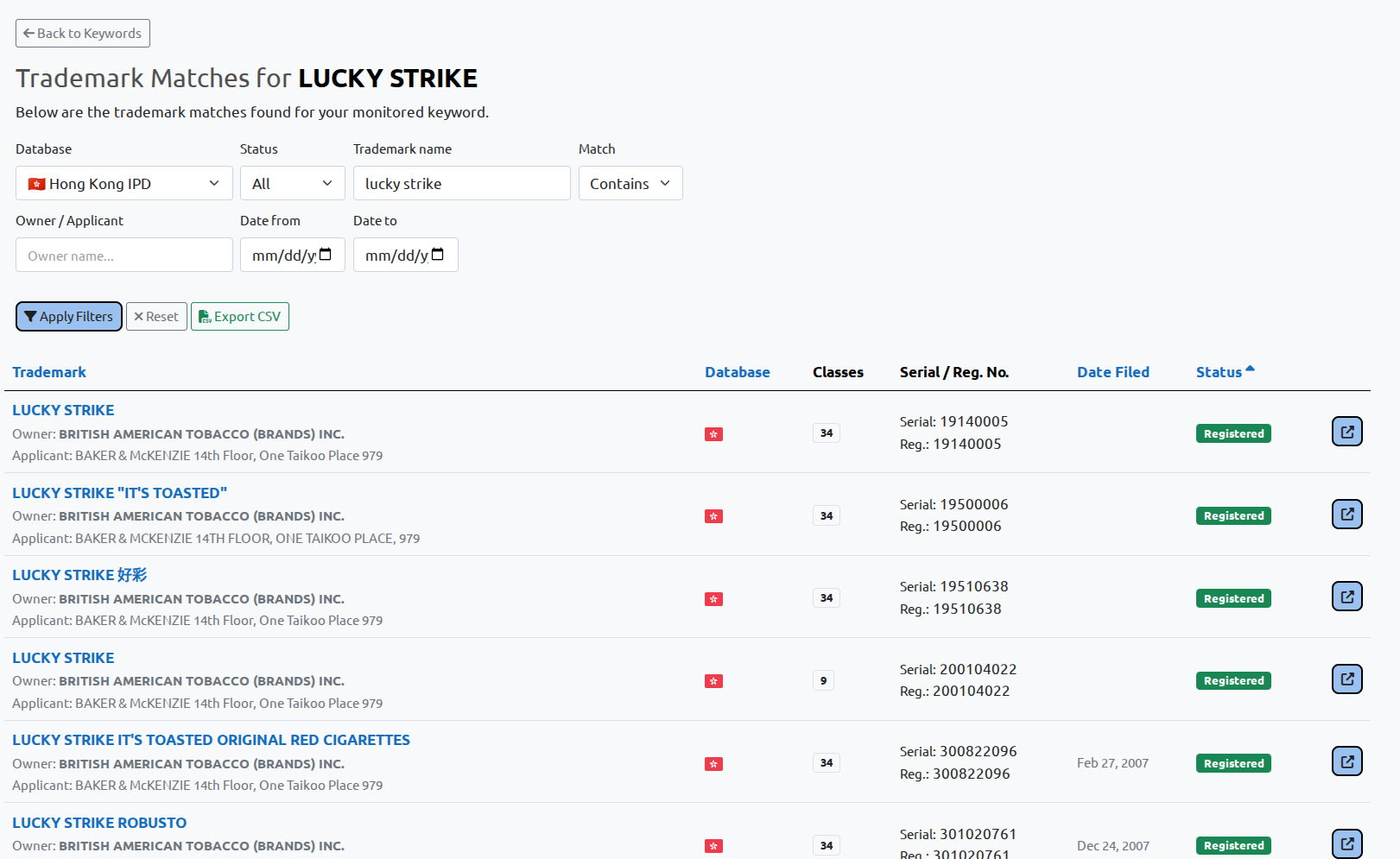 Trademark data from Hong Kong is now monitored and matched against your protected keywords inside the same unified interface already used across other jurisdictions.