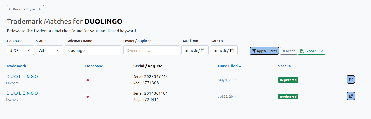 As with all other jurisdictions, JPO results are displayed inside the same normalized trademark detail format, making it easy to compare trademark activity across countries without jumping between separate government portals.